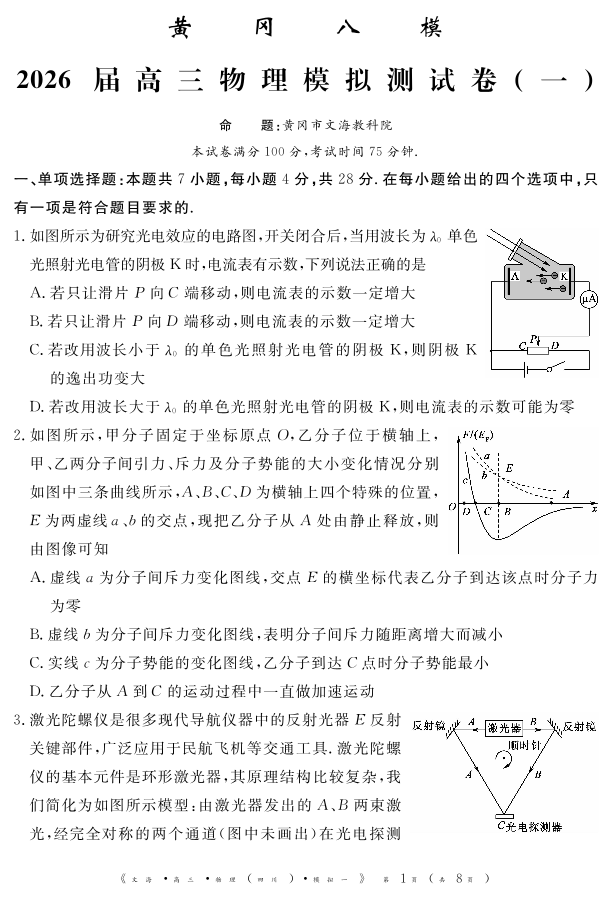 高三物理+答案--四川省黄冈八模2026届高三模拟测试卷(一)