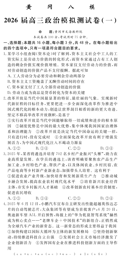 高三政治+答案--四川省黄冈八模2026届高三模拟测试卷(一)