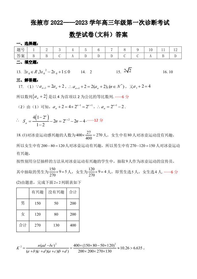 高三文数答案--甘肃省张掖市23届高三上学期第一次诊断考试