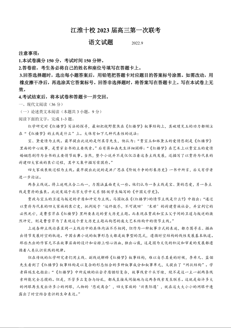 高三语文+答案--安徽省江淮十校2022-2023学年高三上学期第一次联考