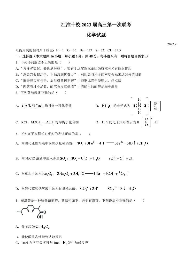 高三化学+答案--安徽省江淮十校2022-2023学年高三上学期第一次联考