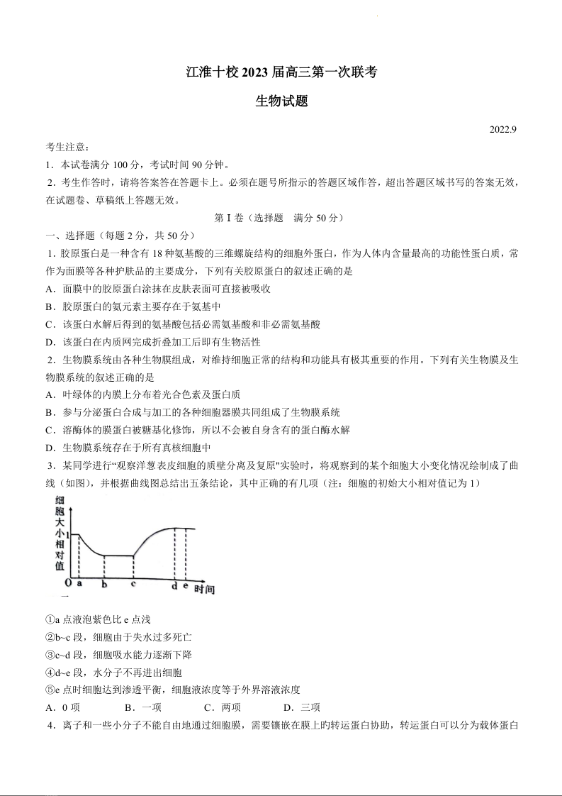 高三生物+答案--安徽省江淮十校2022-2023学年高三上学期第一次联考