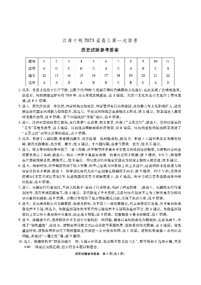 高三历史答案--安徽省江淮十校2022-2023学年高三上学期第一次联考