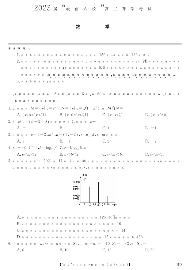 高三数学--安徽省“皖南八校”2023高三开学考试
