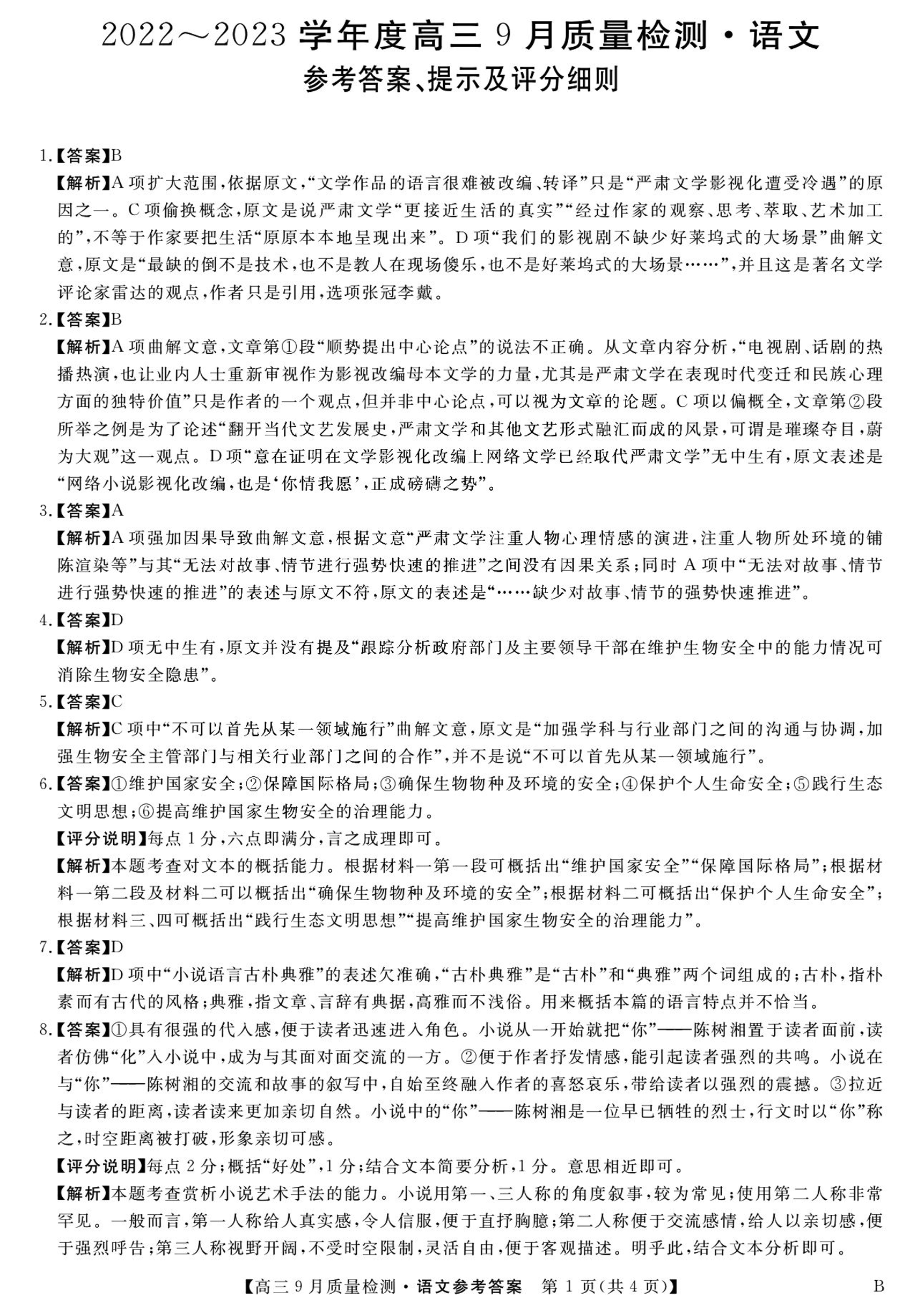 高三语文答案--金科大联考2022-2023学年度高三9月质量检测