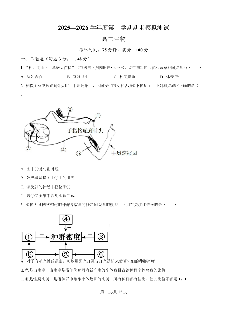 高二生物+答案--贵州省铜仁市松桃民族中学2025-2026学年高二上学期1月期末模拟测试