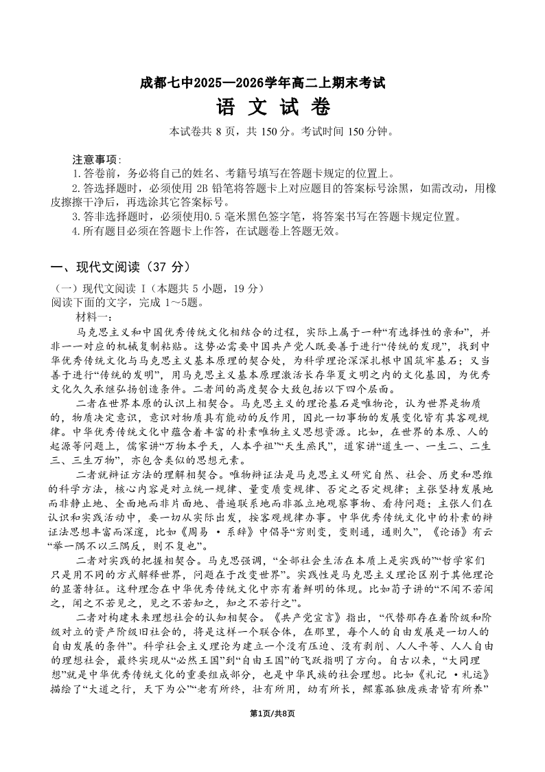 高二语文--四川省成都市第七中学2025一2026学年度上期高二期末考试
