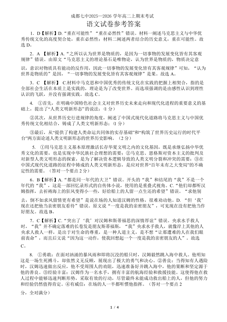 高二语文答案--四川省成都市第七中学2025一2026学年度上期高二期末考试