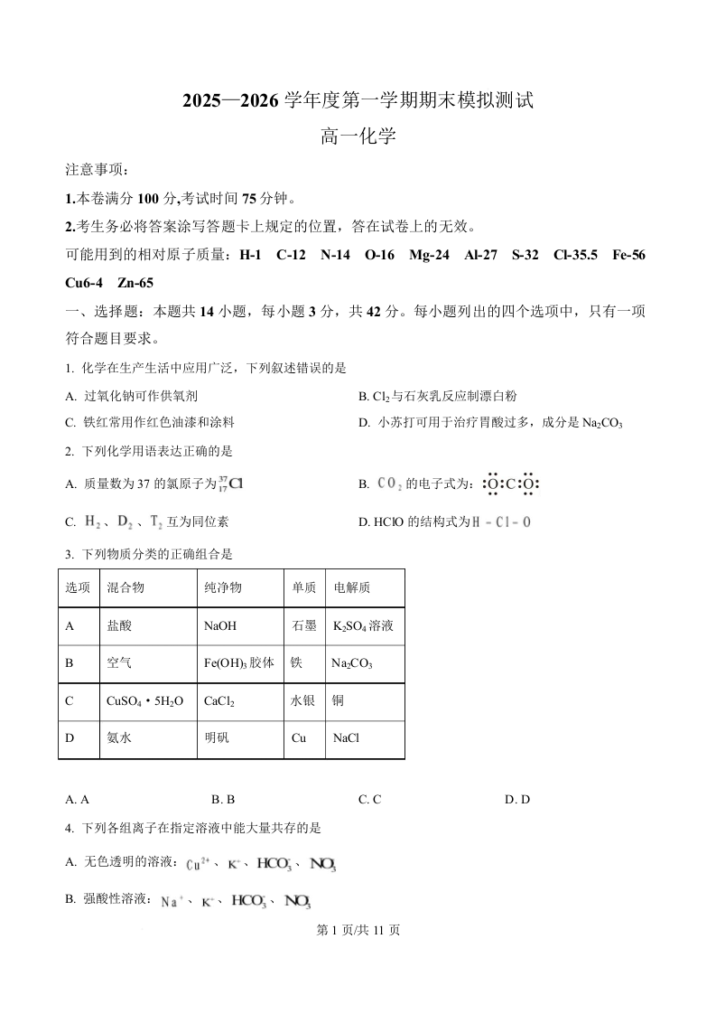 高一化学+答案--贵州省铜仁市松桃民族中学2025-2026学年高一上学期1月期末模拟测试