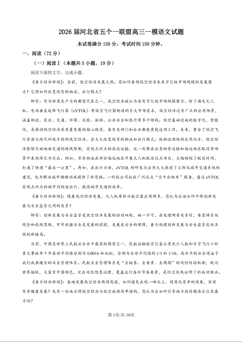 高三语文(原卷版)--河北省五个一联盟2026届高三上学期1月模拟考试