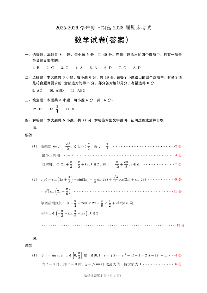 高一数学答案--四川省成都市第七中学2025一2026学年度上期高一期末考试