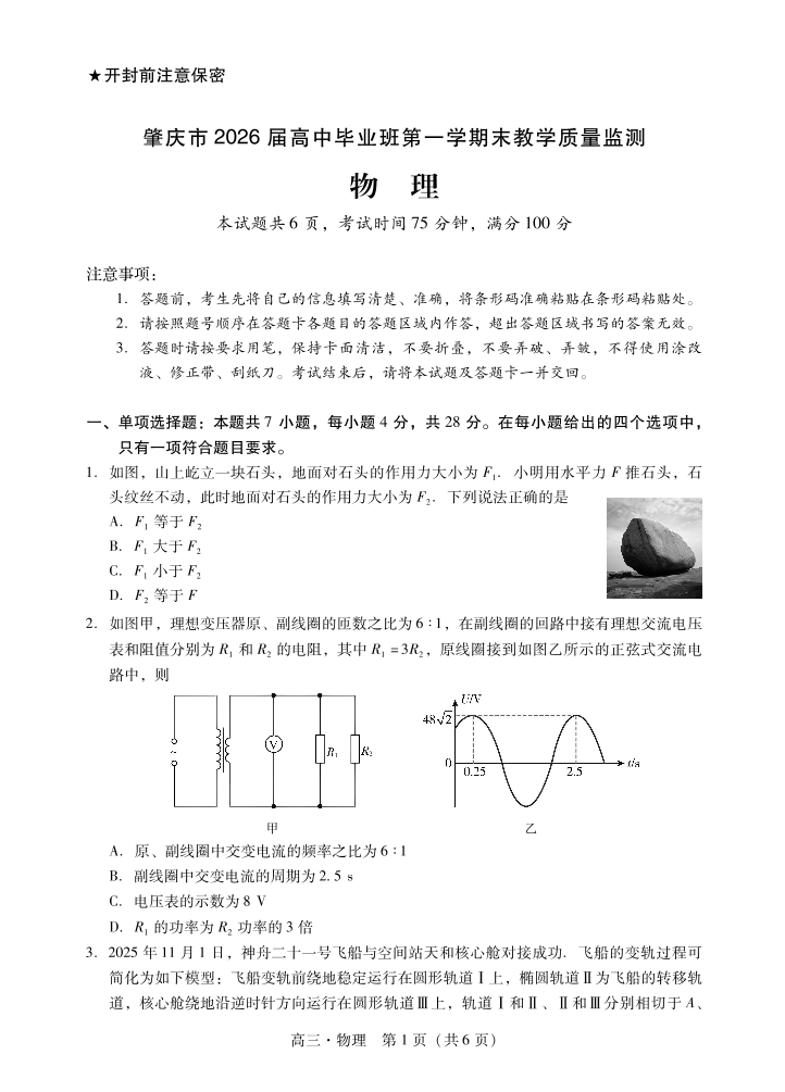 高三物理--广东省肇庆市2026届高中毕业班高三年级第一学期末教学质量监测(肇庆二模)