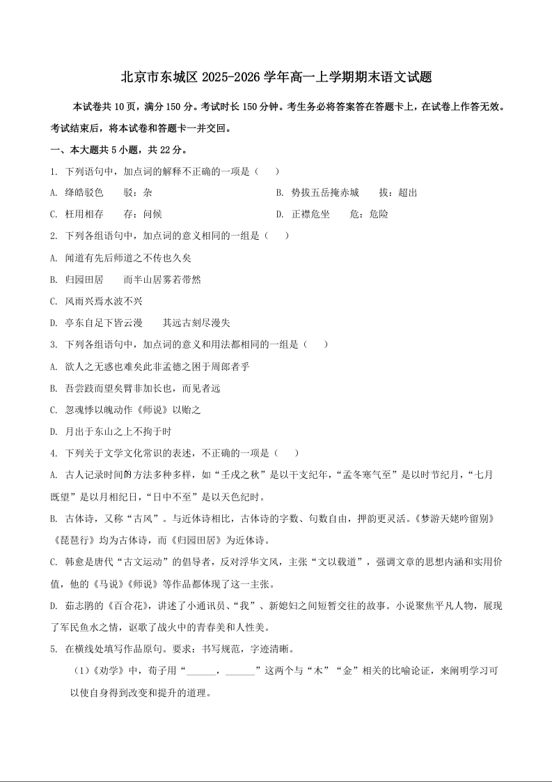 高一语文+答案--北京市东城区2025-2026学年高一上学期期末
