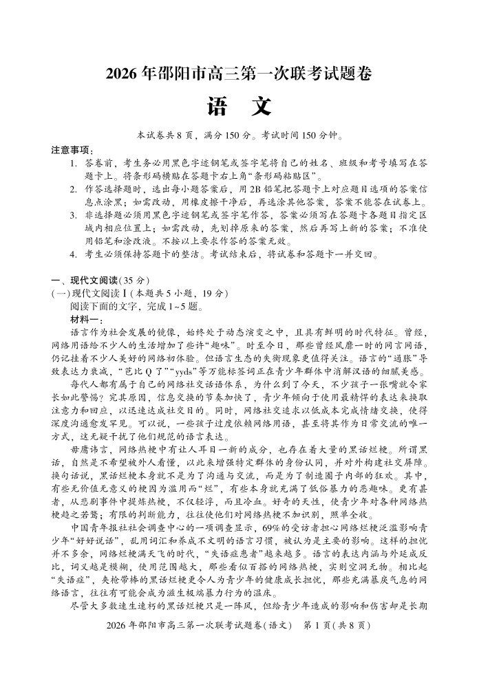 高三语文--湖南省邵阳市2026届高三第一次联考(邵阳一模)