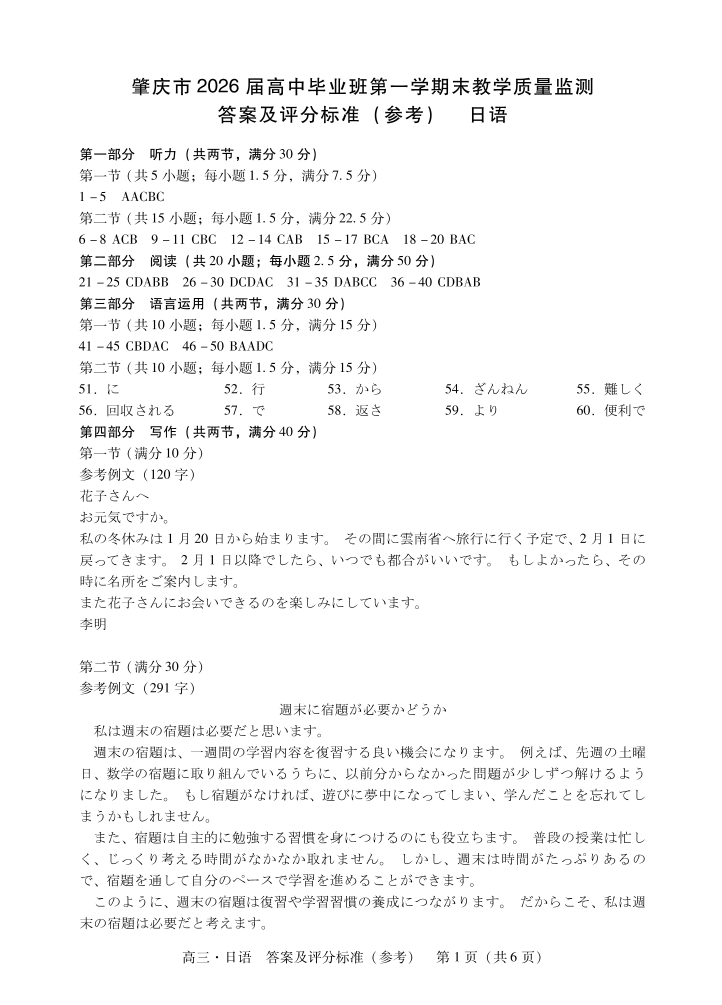 高三日语答案--广东省肇庆市2026届高中毕业班高三年级第一学期末教学质量监测(肇庆二模)