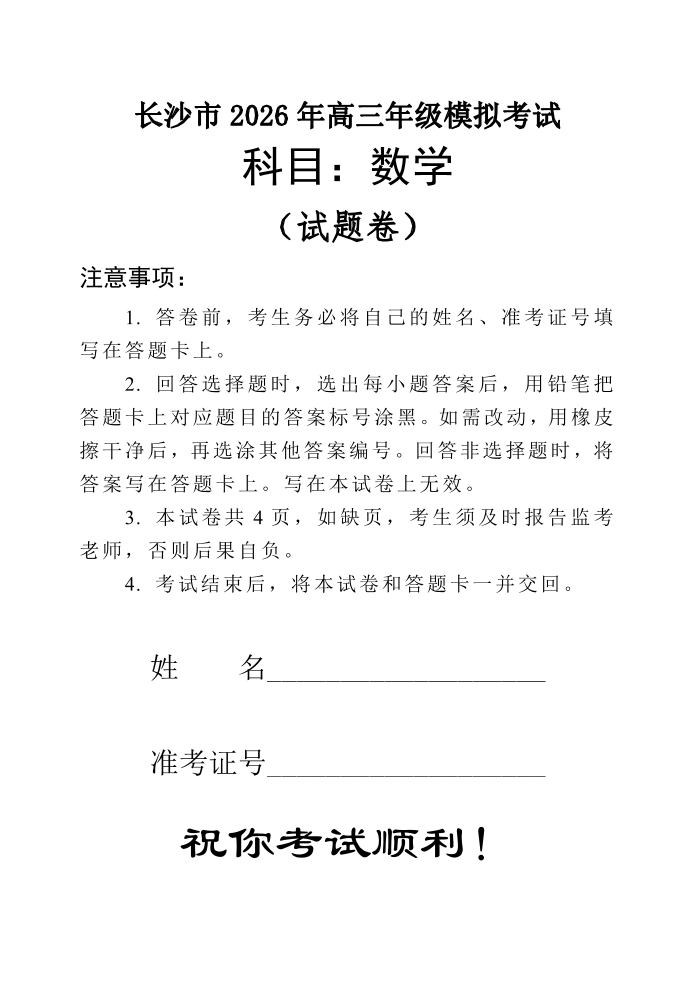 高三数学--湖南省长沙市2026届高三年级模拟考试(长沙一模)