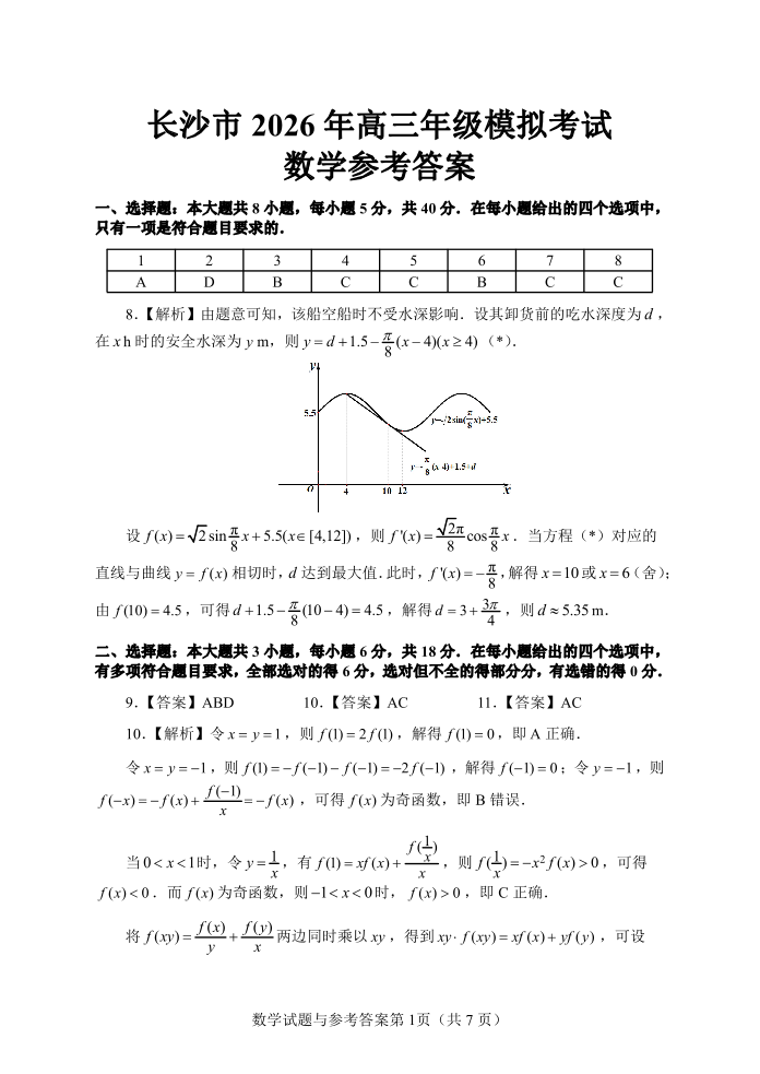 高三数学答案--湖南省长沙市2026届高三年级模拟考试(长沙一模)