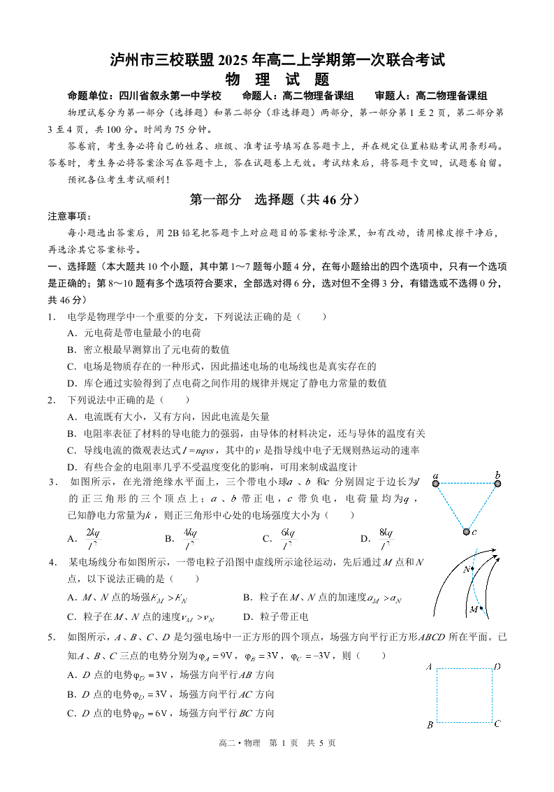 高二物理--四川省泸州市三校联盟2025-2026学年高二上学期第一次联合考试