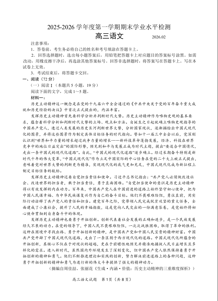 高三语文--山东省青岛区域2026.2高三期末检测