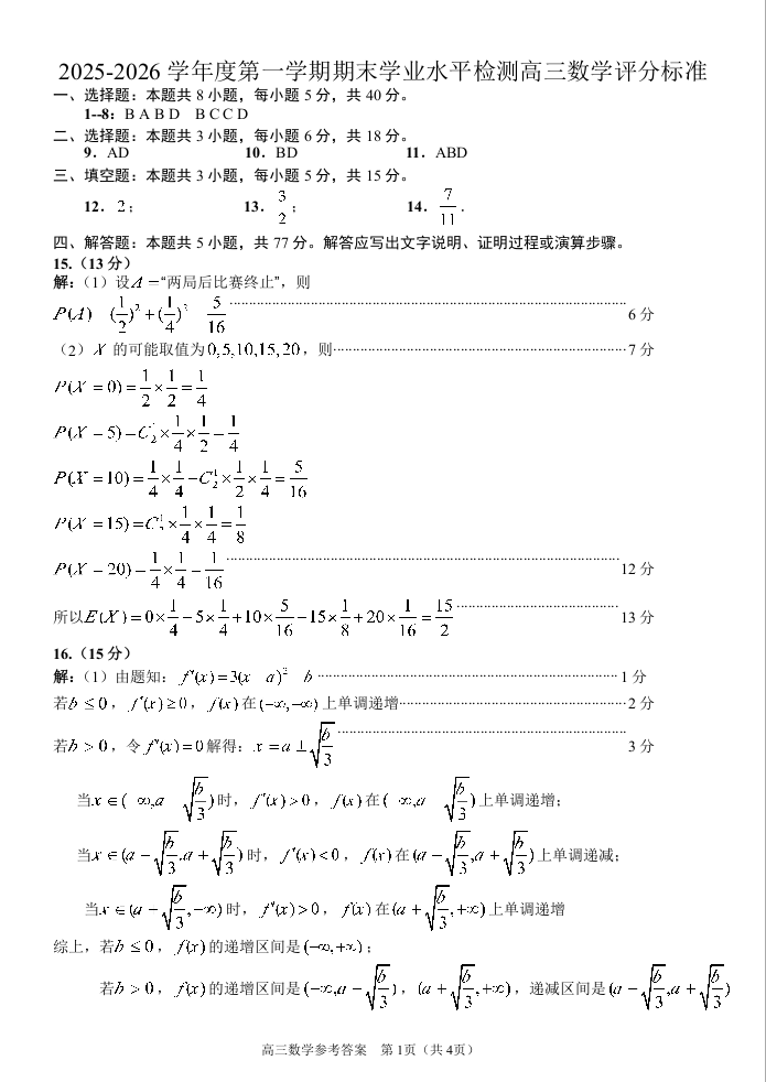 高三数学答案--山东省青岛区域2026.2高三期末检测