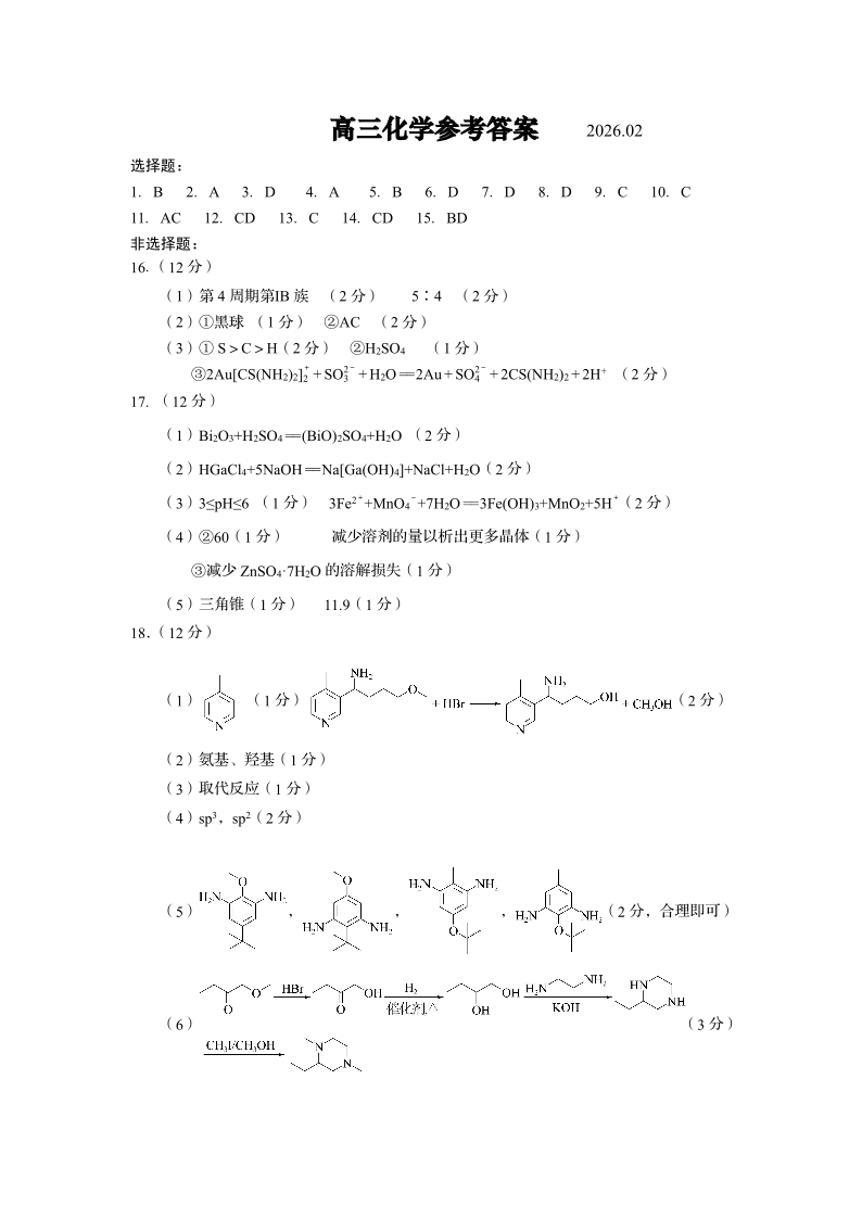 高三化学答案--山东省青岛区域2026.2高三期末检测