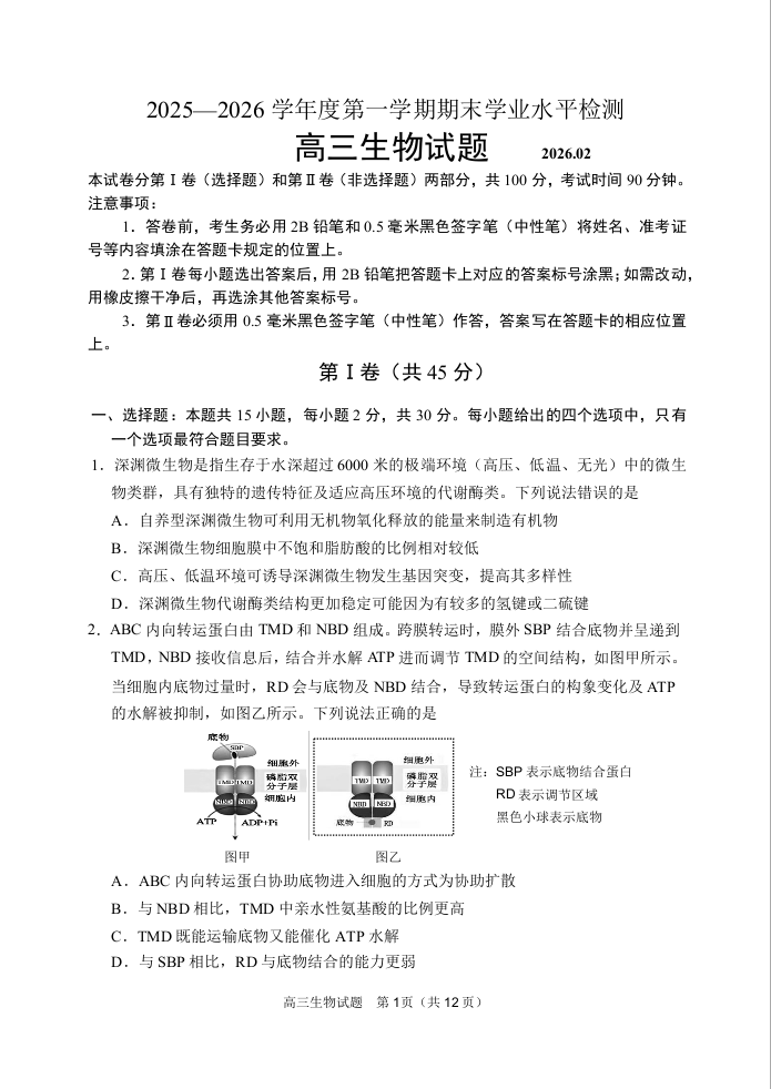 高三生物--山东省青岛区域2026.2高三期末检测