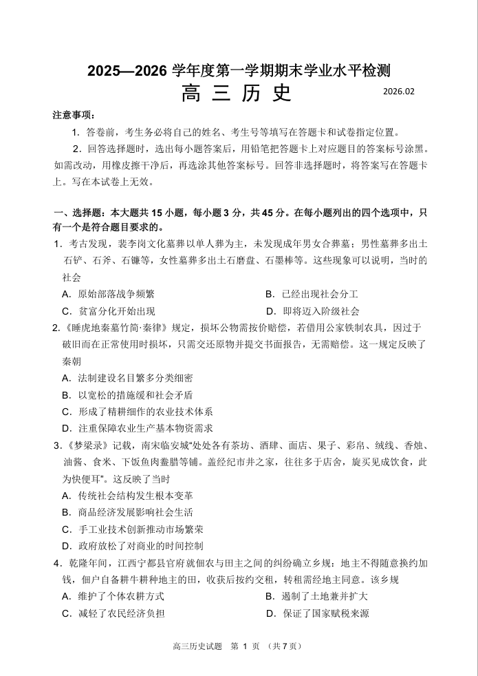 高三历史--山东省青岛区域2026.2高三期末检测