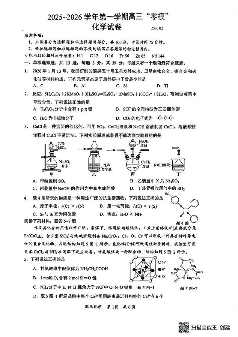 高三化学+答案--江苏省镇江市2026届高三上学期零模
