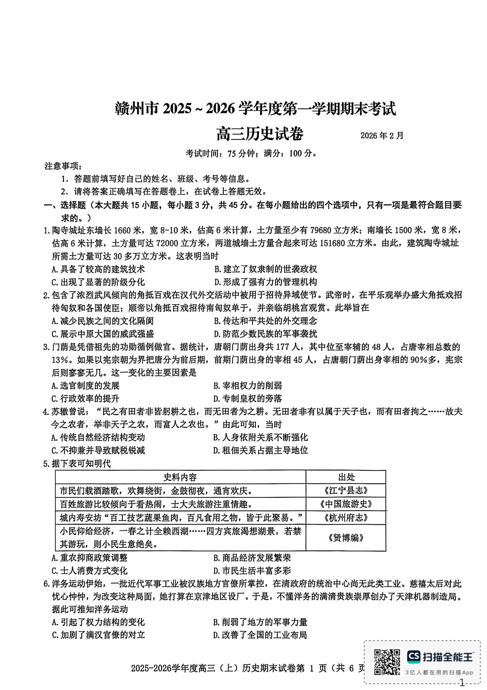 高三历史--江西省赣州市2026届第一学期高三上学期期末考试