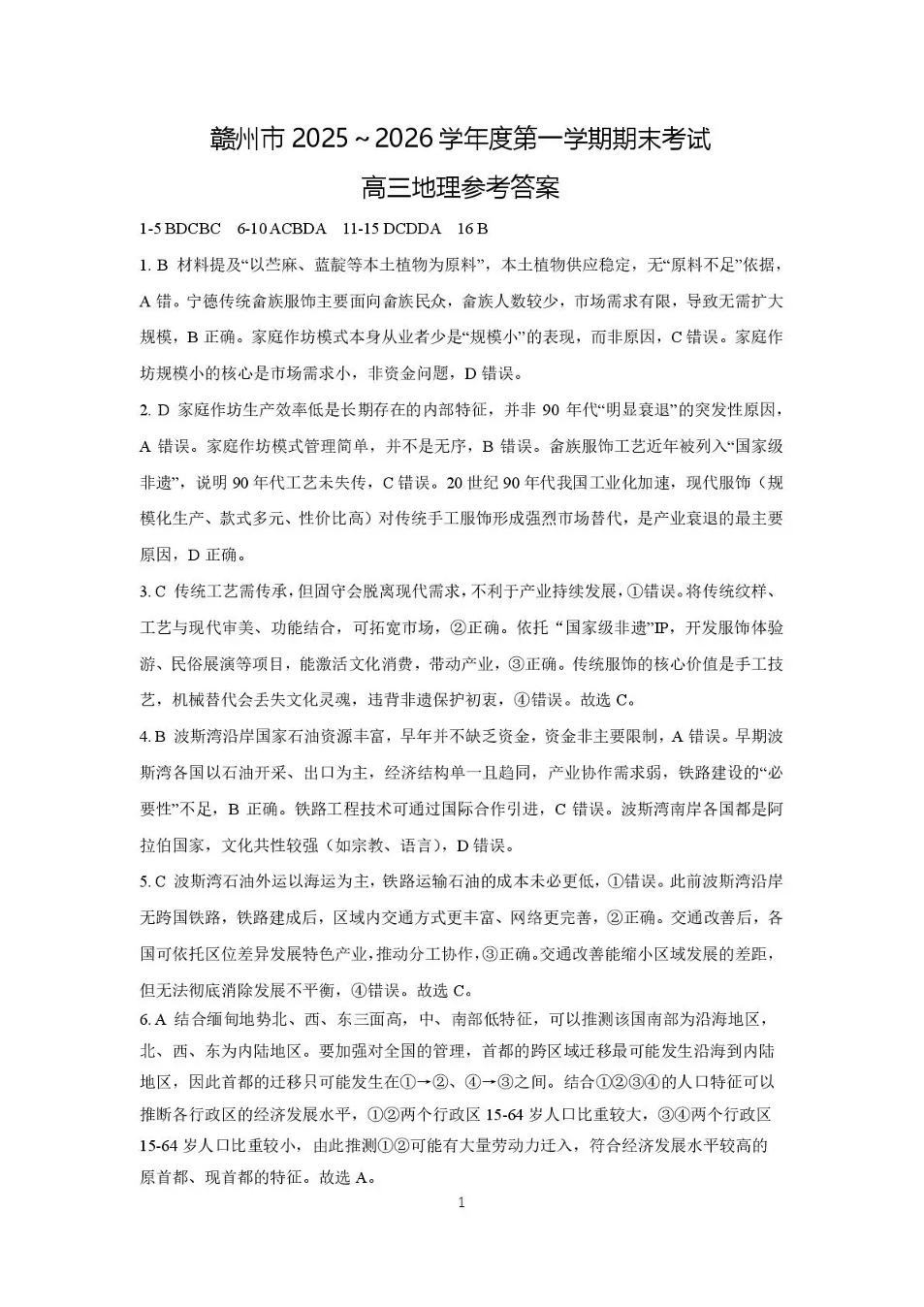 高三地理答案--江西省赣州市2026届第一学期高三上学期期末考试