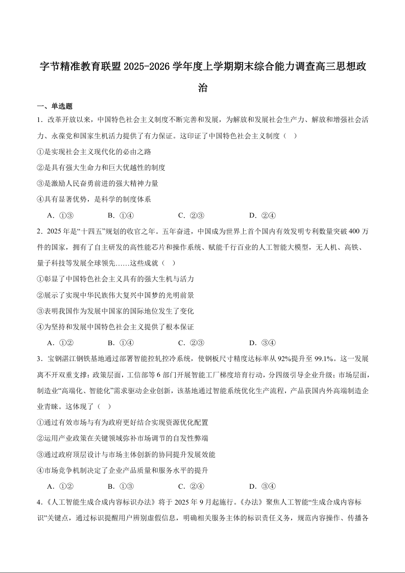 高三政治+答案--四川省字节精准教育联盟2026届高三上学期期末综合能力调查