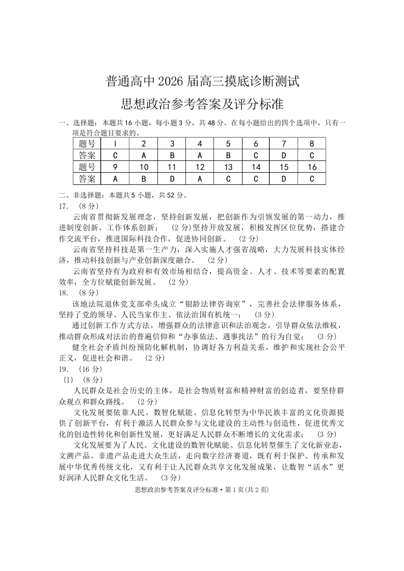 高三政治答案--云南省昆明市2026届高三上学期1月期末摸底诊断测试