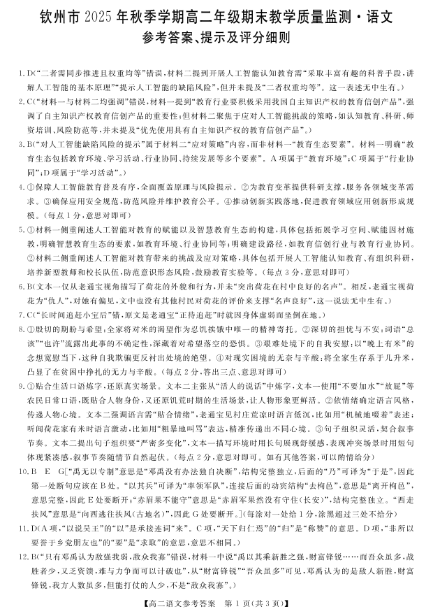 高二语文答案--广西钦州市2025-2026高二上学期期末教学质量检测