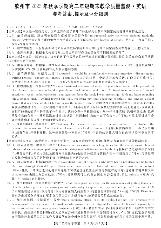 高二英语答案--广西钦州市2025-2026高二上学期期末教学质量检测