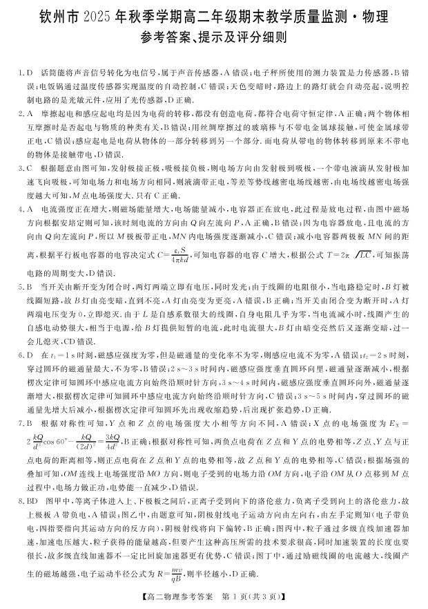 高二物理答案--广西钦州市2025-2026高二上学期期末教学质量检测