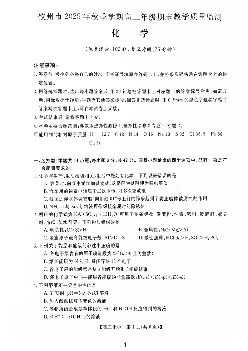高二化学--广西钦州市2025-2026高二上学期期末教学质量检测