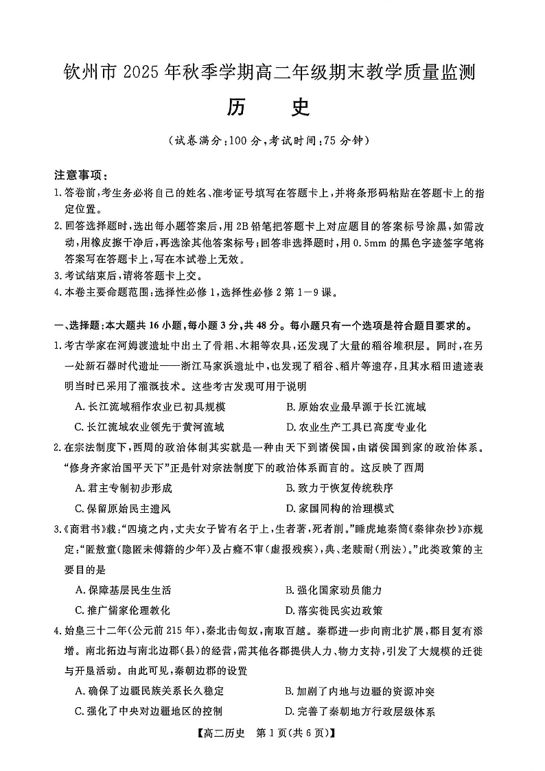 高二历史--广西钦州市2025-2026高二上学期期末教学质量检测