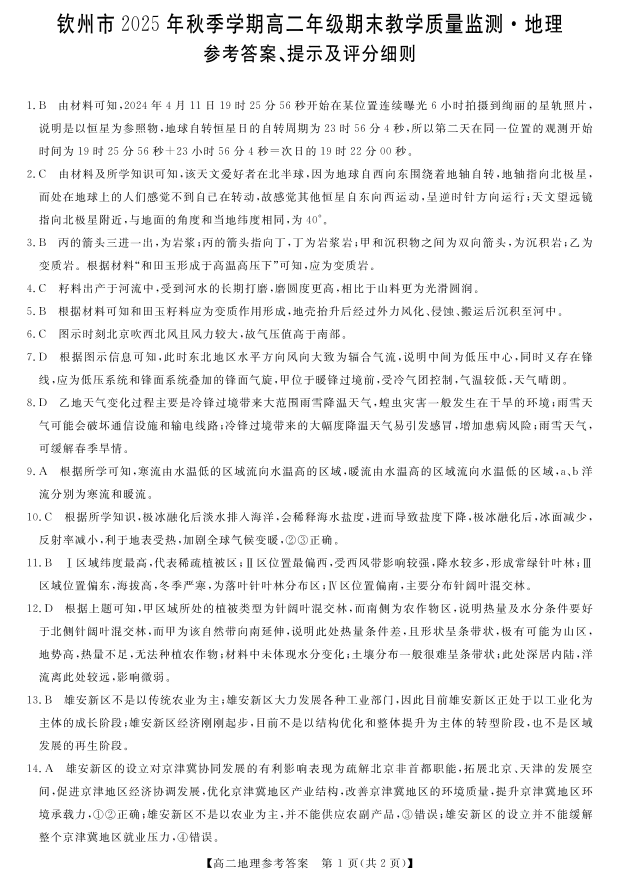 高二地理答案--广西钦州市2025-2026高二上学期期末教学质量检测