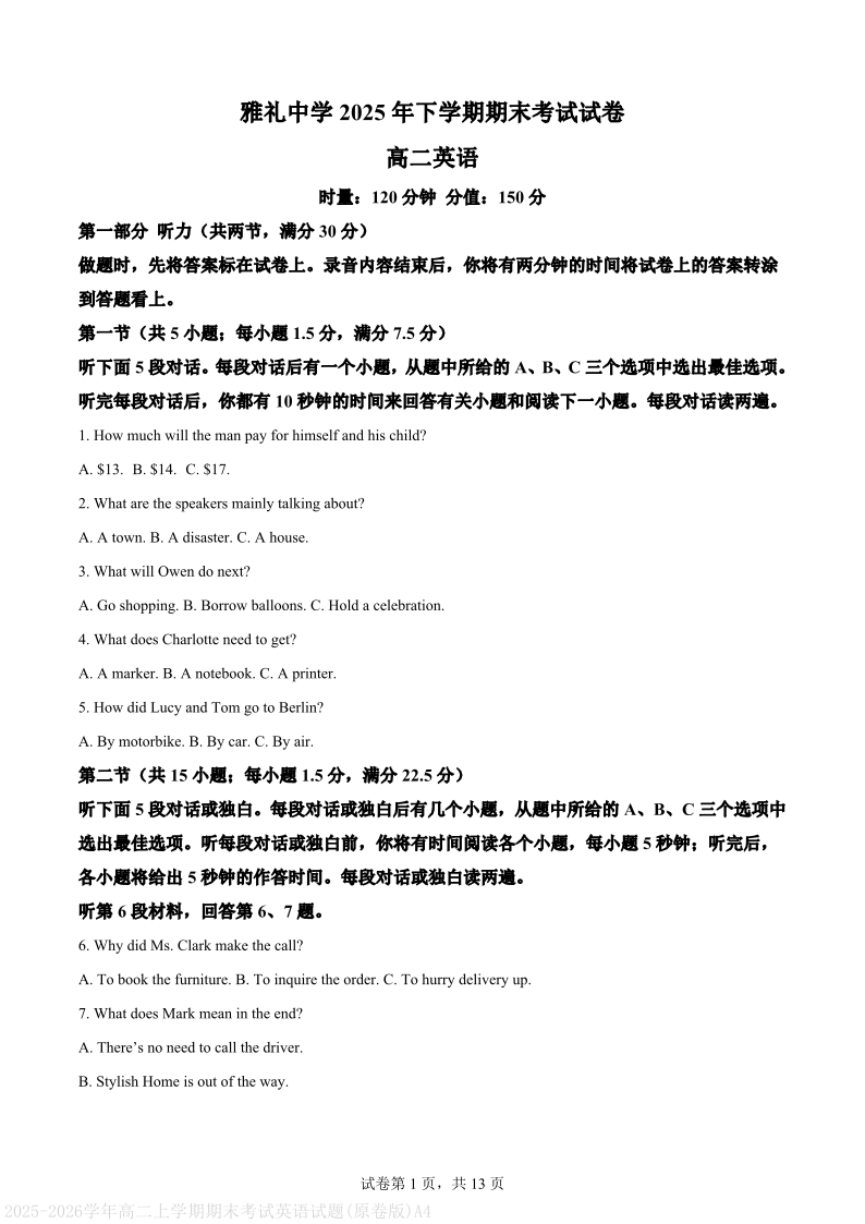 高二英语(原卷版)--湖南省长沙市雅礼中学2025-2026学年高二上学期期末考试