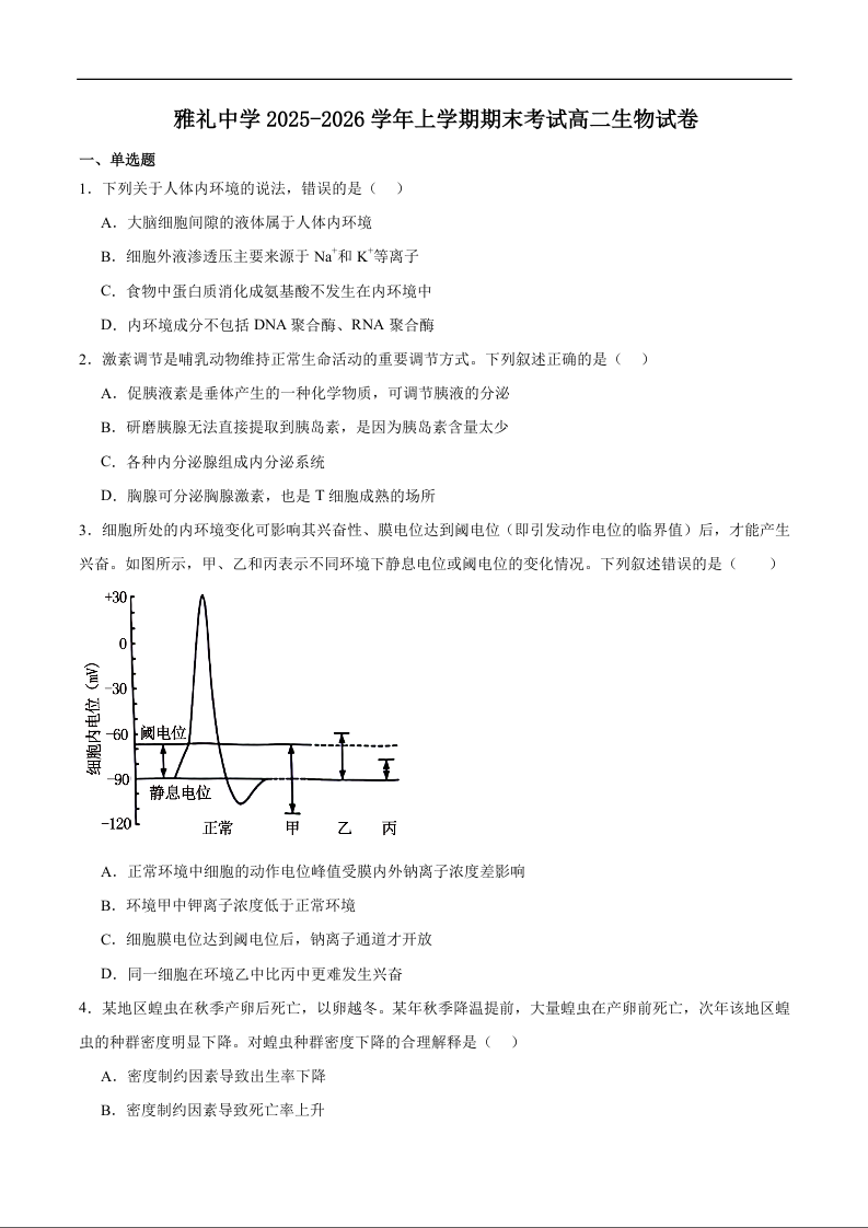 高二生物+答案--湖南省长沙市雅礼中学2025-2026学年高二上学期期末考试