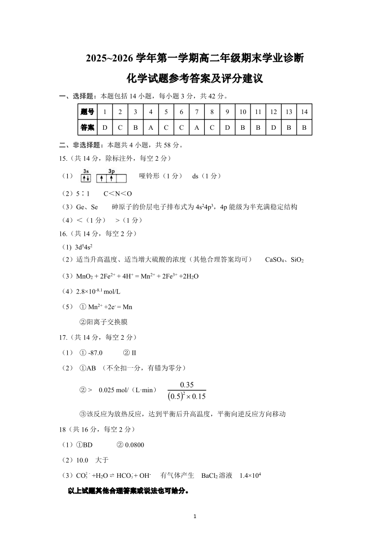高二化学答案--山西省太原市2025-2026学年高二上学期期末学业诊断