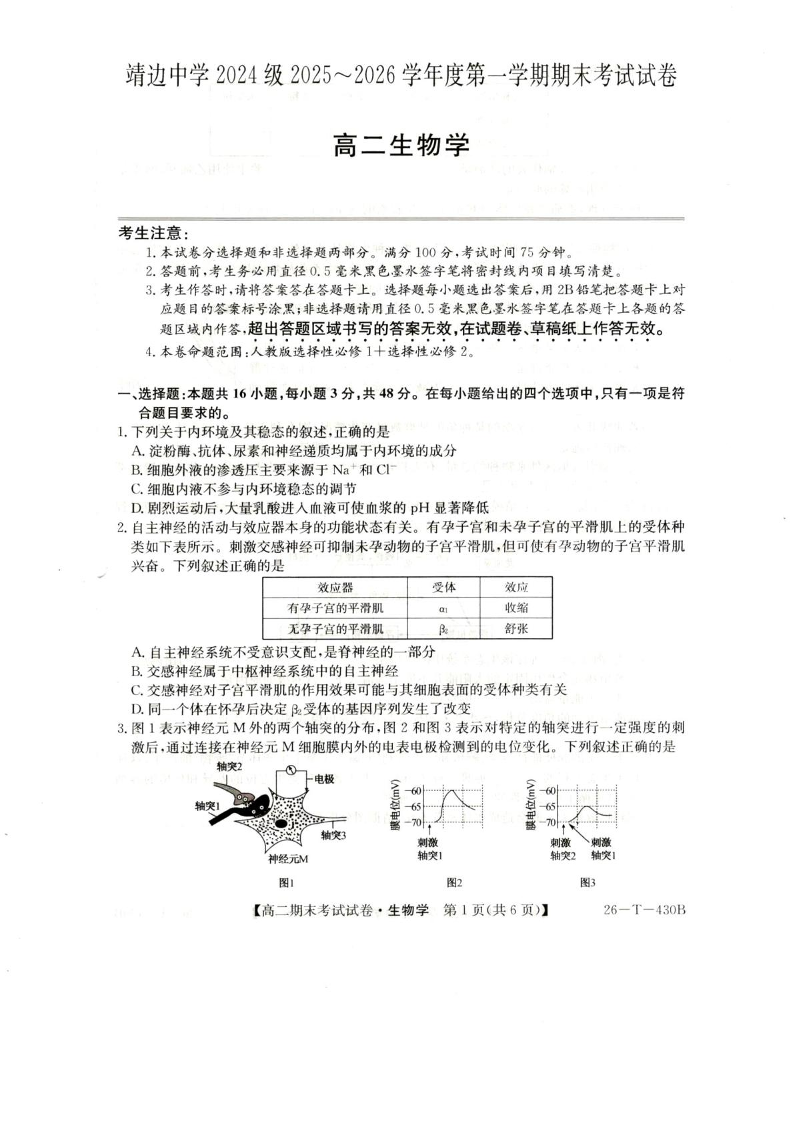 高二生物--陕西省榆林市靖边县靖边中学2025-2026学年高二上学期期末考试