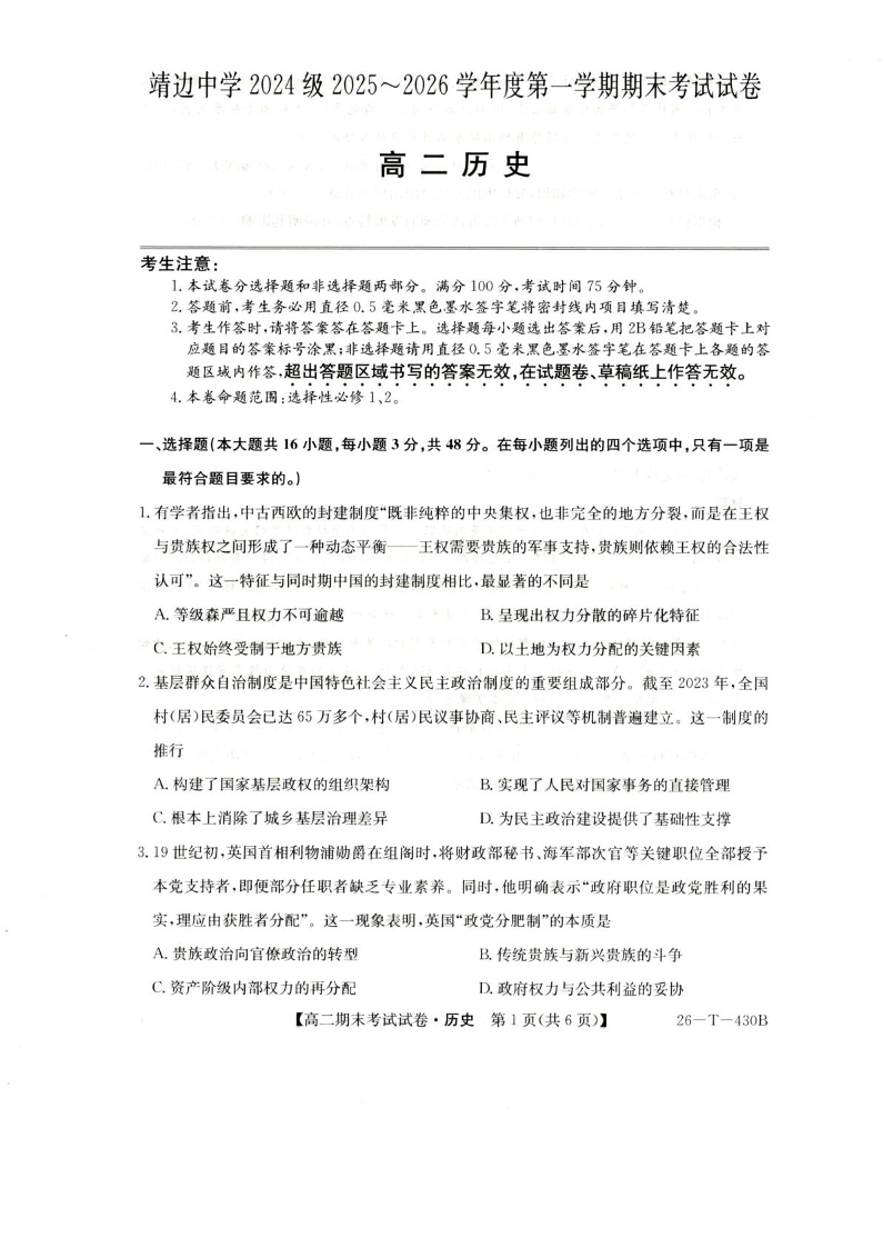 高二历史+答案--陕西省榆林市靖边县靖边中学2025-2026学年高二上学期期末考试