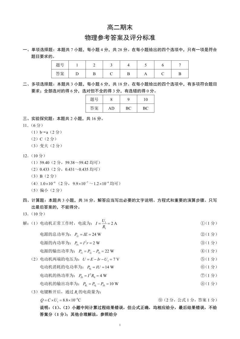 高二物理答案--四川省蓉城名校联盟2025-2026学年高二上学期期末考试