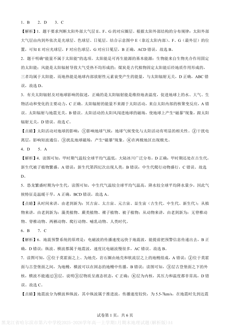 高一地理(解析版)--黑龙江省哈尔滨市第六中学2025-2026学年高一上学期期末