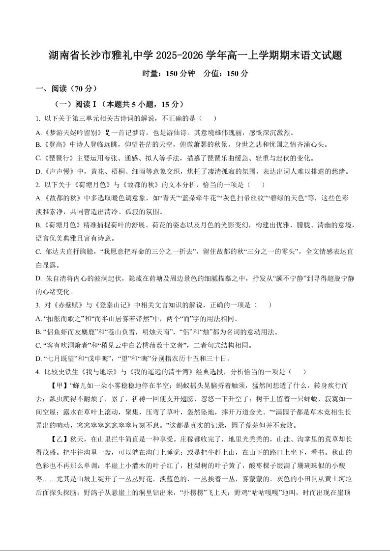 高一语文+答案--湖南省长沙市雅礼中学2025-2026学年高一上学期期末考试