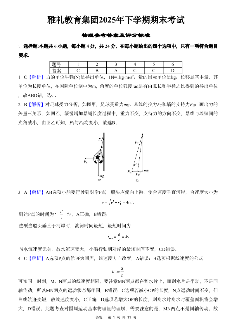 高一物理答案--湖南省长沙市雅礼中学2025-2026学年高一上学期期末考试