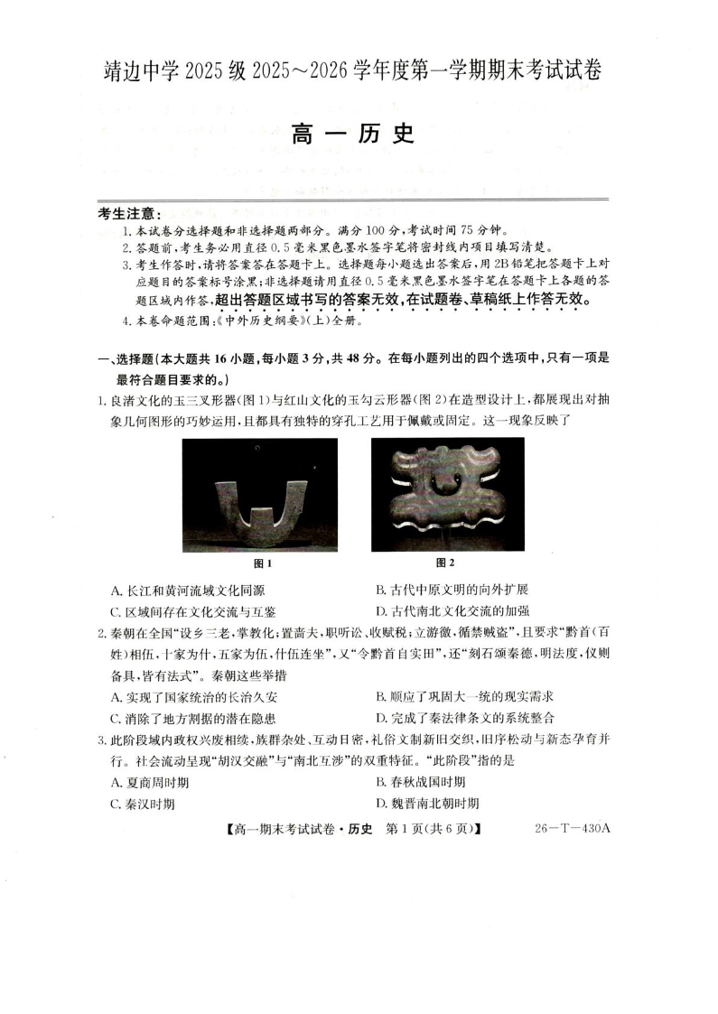 高一历史+答案--陕西省榆林市靖边县靖边中学2025-2026学年高一上学期期末考试