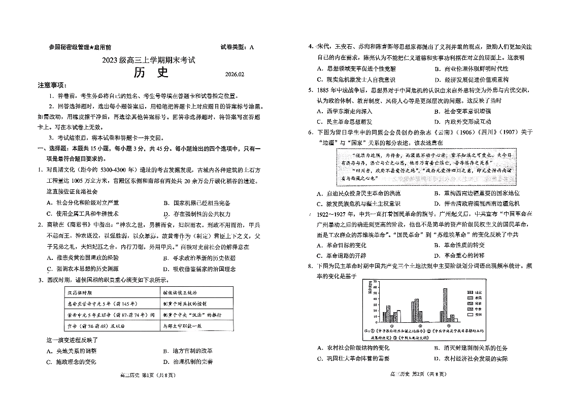 高三历史--山东省日照市2023级(2026届)高三年级上学期期末考试
