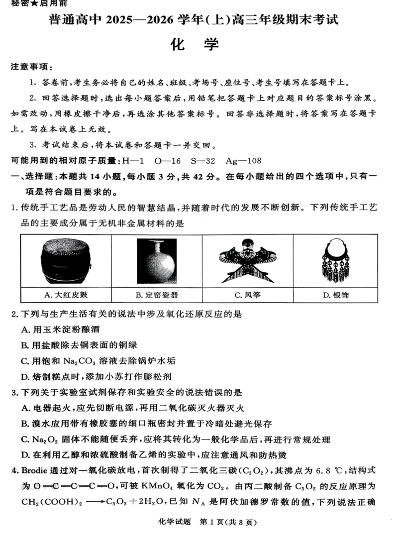高三化学--河南省青桐鸣大联考普通高中2026届高三上学期期末考试